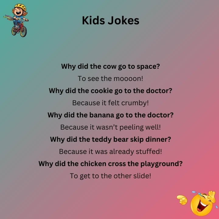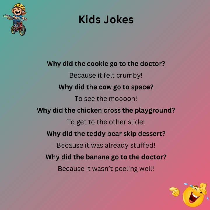 Get ready for lots of laughs! These Kids Jokes are simple, funny, and easy to remember. With these jokes, every kid can make their friends and family laugh like a little comedian. So get ready to smile and have fun!