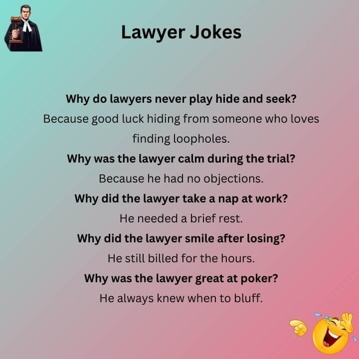 Get ready to laugh with some funny Lawyer Jokes! These jokes are full of clever and silly humor that will make anyone smile. Whether you’re a lawyer, a student, or just love a good laugh, these jokes will brighten your day. Court has never been this funny!