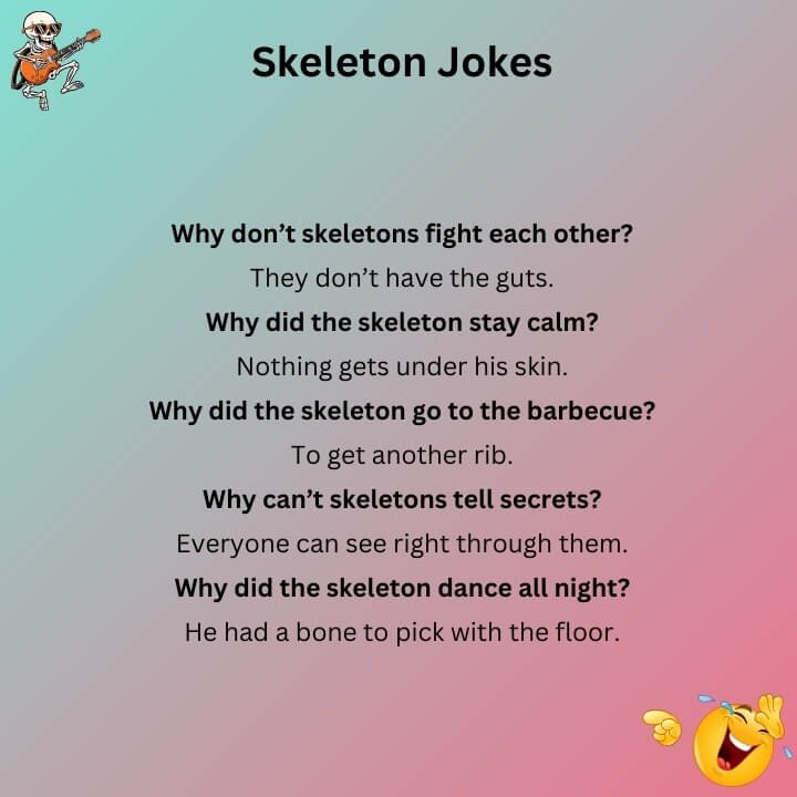 Get ready to laugh until your ribs hurt! These Skeleton Jokes are full of silly and funny bone humor that will make anyone smile. From spooky laughs to clever bone jokes, this list will bring some fun to your day. Whether it’s Halloween or just a time for a good laugh, these skeleton jokes will surely make everyone giggle and rattle with laughter!
